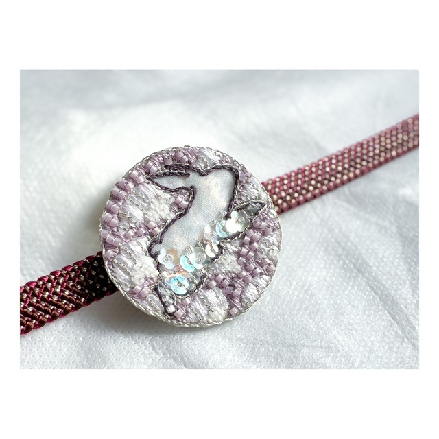 ▷ 手刺繍の帯留 -波を渡るうさぎ- ◁ ・・・・・・・・・・・ オーロラを纏ったうさぎが軽々と波の向こうへ渡る様子を、キラキラとした波をスパンコールやビーズで表現しました。 うさぎにはオーロラ色になるよう、中にスパンコールをあしらい刺繍した作品です。 スパンコールには丸だけではない、様々な形のものを使用し、水飛沫を表現しました。 ・・・・・・・・・・・ ▶︎手刺繍による1点もの作品です ▶︎帯留金具は吉春吉オリジナル金具を使用。他にはないサイズで帯の対比率にちょうど良いアートサイズを追求したオリジナル品にしております。 ▶︎フラットな帯留なので、ぶつかりを気にせずご着用頂けます。(写真参照) ▶︎桐箱に入れてお届け致します。(写真参照) ・・・・・・・・・・・ 《寸法》直径約4cm 《素材》本体:木綿糸、ビーズ、スパンコール / 金具:真鍮 《刺繍》吉春吉オリジナル手刺繍 《本体価格》¥22,000(¥20,000) made in Japan ・・・・・・・・・・・ ▶︎モニター上のお色と実際の商品のお色について ご使用中のモニターによって、多少の色合いの差が生じることがございます。ご了承ください。 ▶︎素材について ・繊細な生地や刺繍ですので、引っ掛けには十分ご注意ください。万が一ひっかかった場合は絶対に引っ張らず、優しく直して下さい。 ・水洗いはご遠慮ください。 ▶︎お届けについて ・桐箱を袋に入れ、段ボール箱にてお届け致します。 ・リボンやシールをつけた簡易ギフト包装も承ります。 ・発送に日時指定がございましたら【ヤマト宅急便】を選択し、希望到着日をご記入ください。