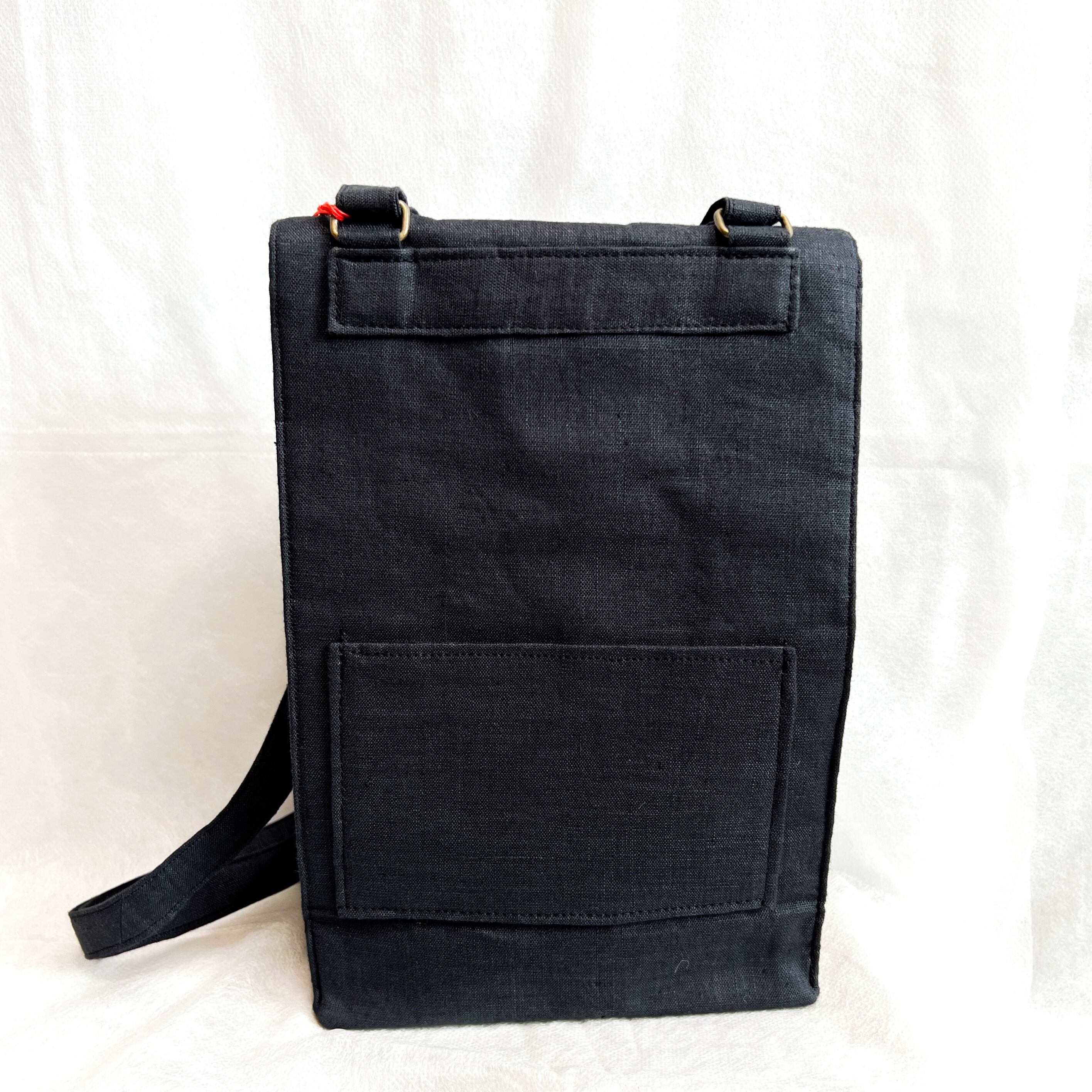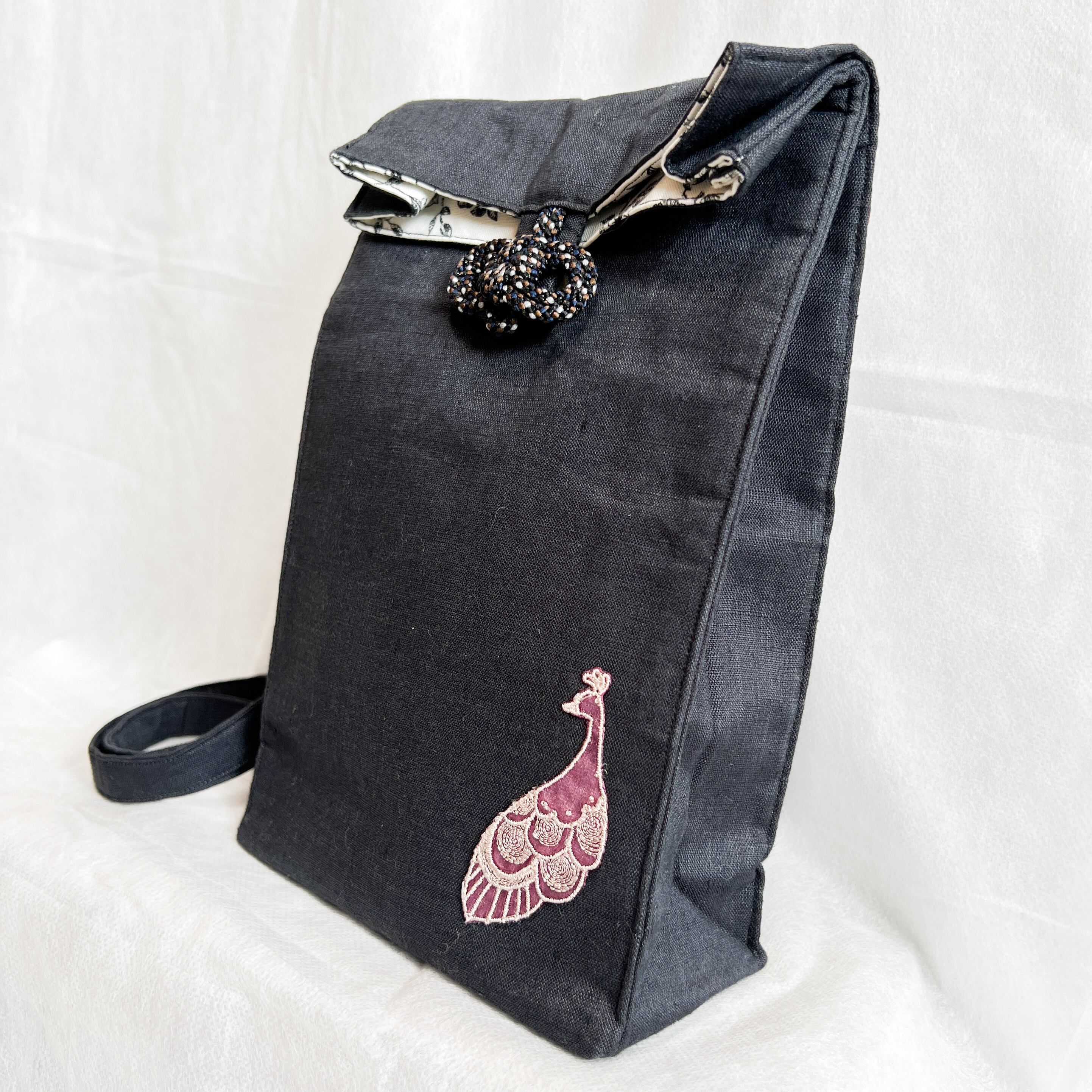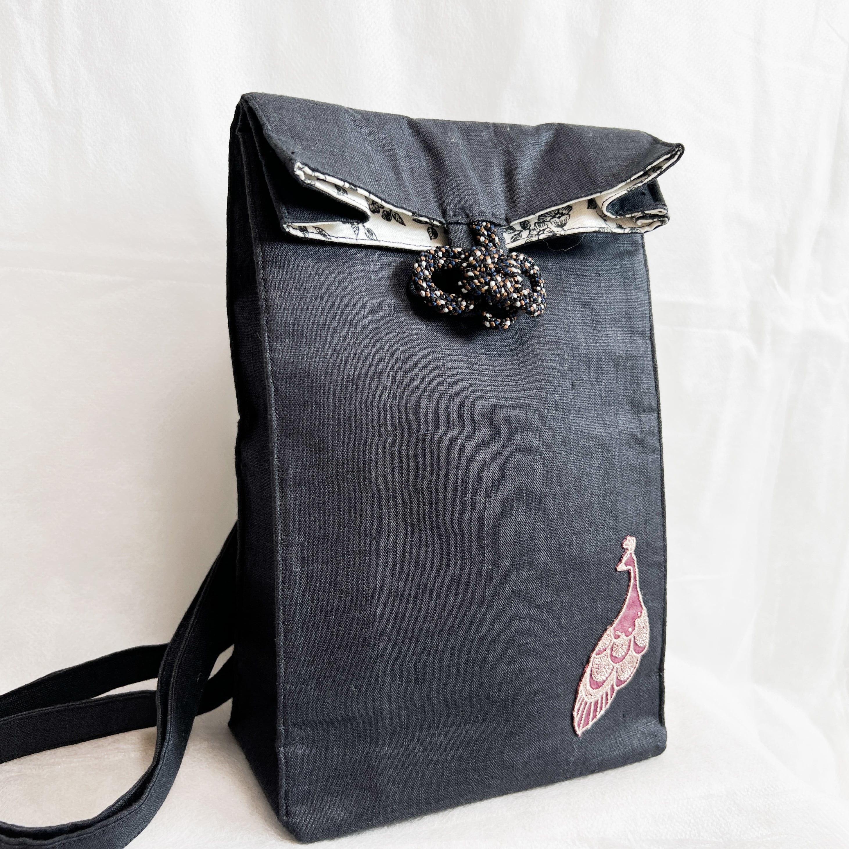 ▶︎ 本体の生地には麻を使用し、留め具部分にはオリジナルの組紐で制作した【二重叶え結び】をあしらいました。
