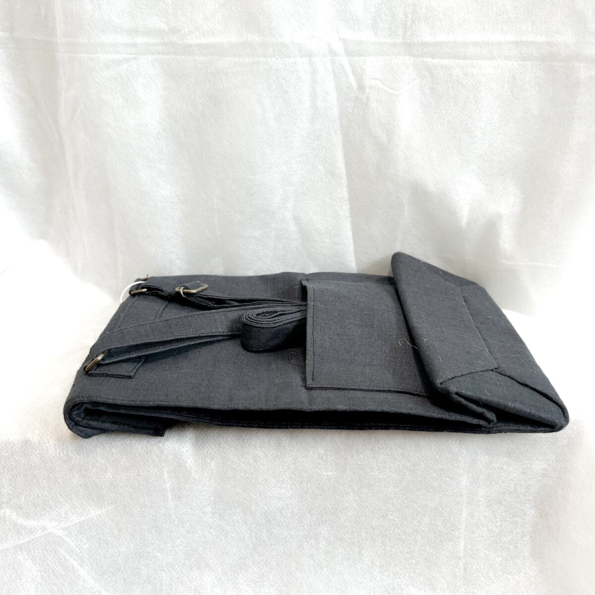 ▶︎ 本体の生地には麻を使用し、留め具部分にはオリジナルの組紐で制作した【二重叶え結び】をあしらいました。