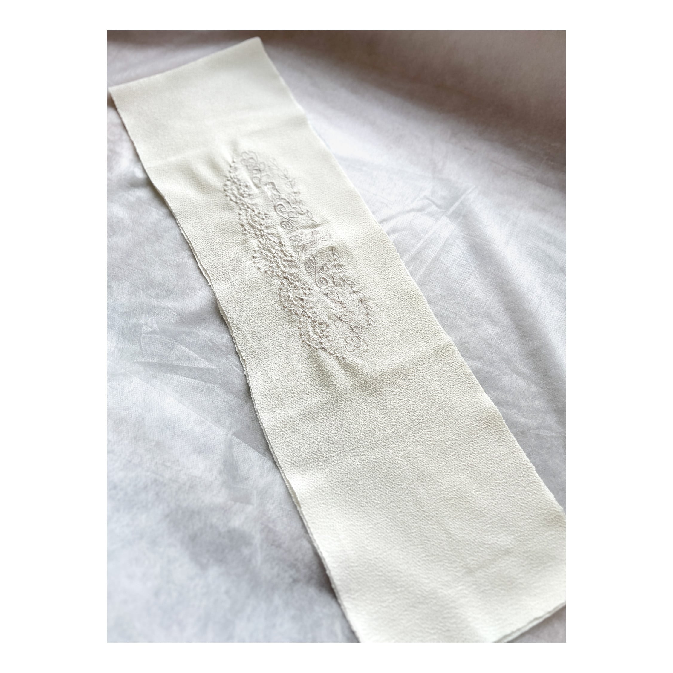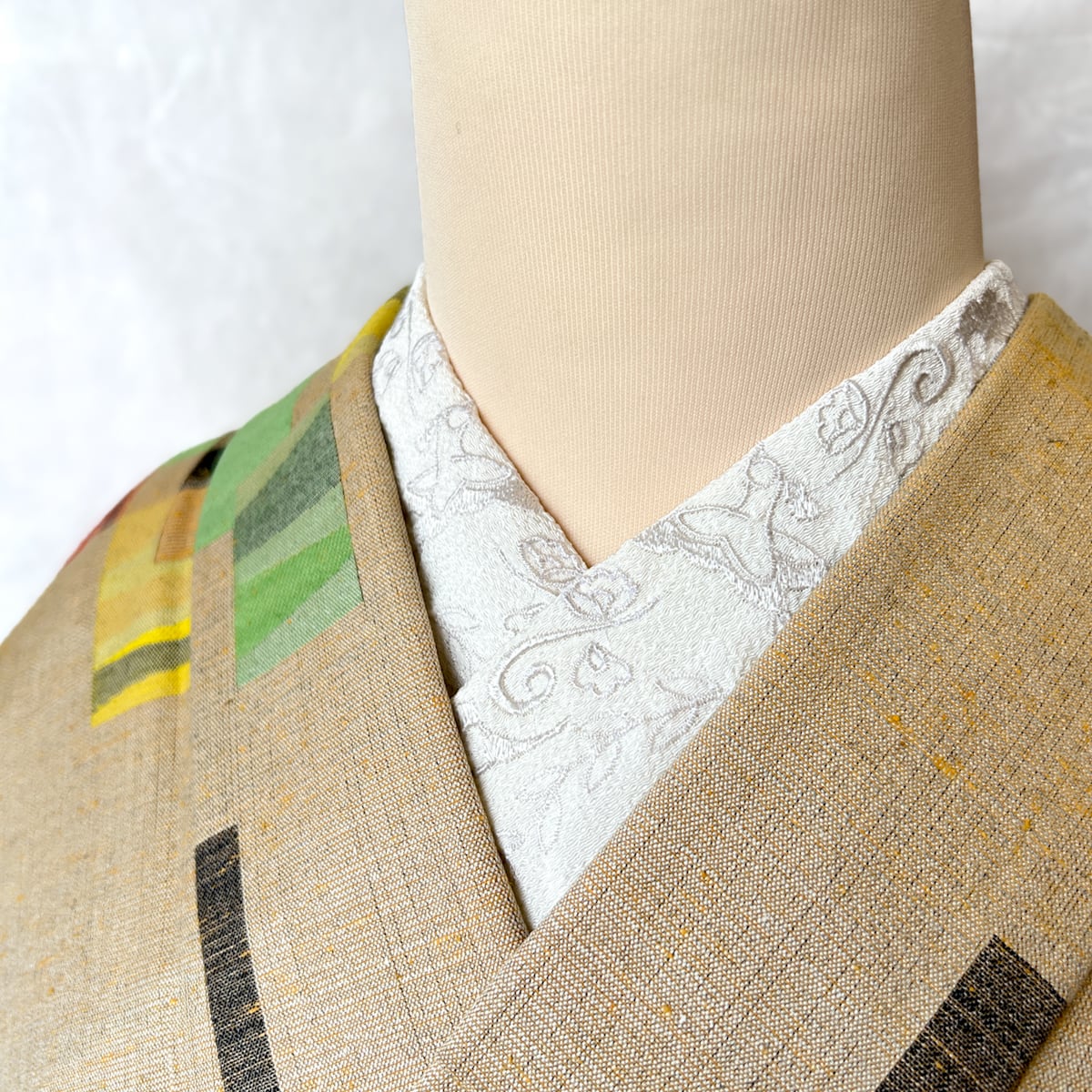 オフホワイトの生地にパールホワイトの刺繍糸を使用しているため、白の差が綺麗に出て、どんなお着物にも合わせやすく、通常の白よりもお顔周りは柔らかな印象になります。