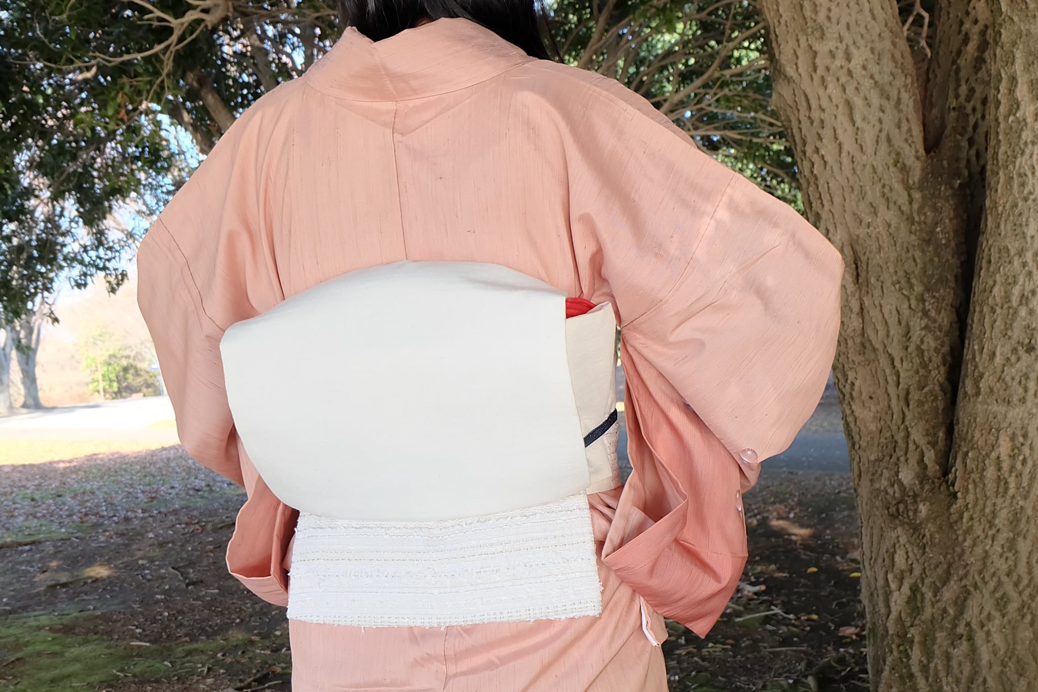 お太鼓はすっきりとした見栄えになるので、どんな柄の着物でも合わせやすく、胴回りには上下半分で生地感を変えコーディネートが楽しくなるようお仕立てしました。